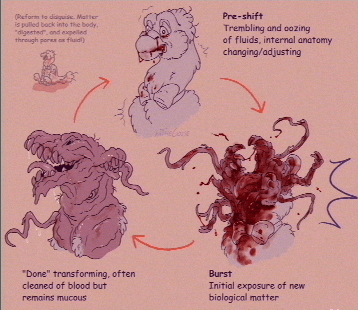 Internal organs also function as usual when in full "goose"-state. It is able to live a fully avian lifestyle as is, but where's the fun in that as a shapeshifting meat alien? (There's gotta be the occasional nasty icky flesh explosion!!!)