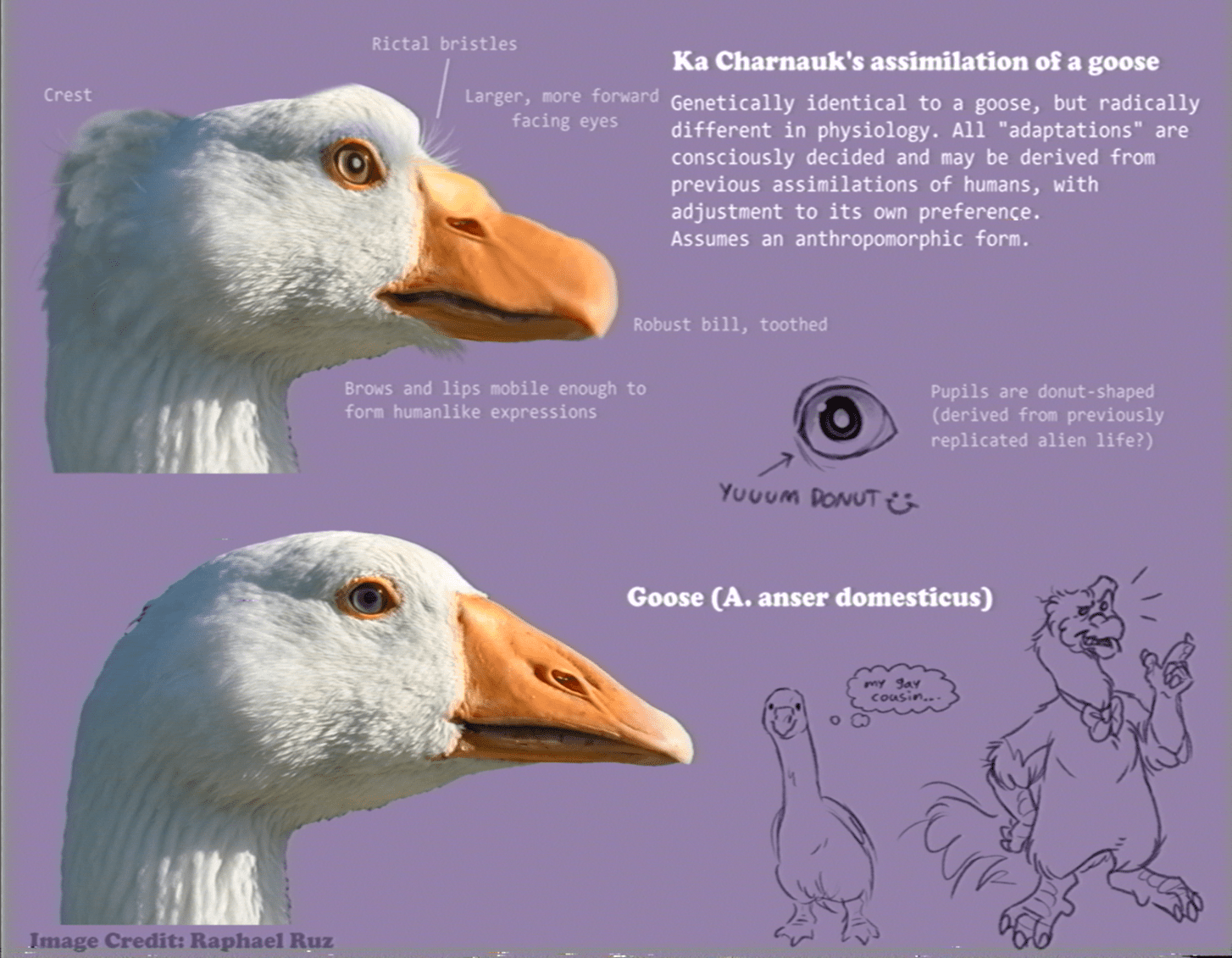 In its usual goose-form however, Ka is just as interesting! While adapting to life as a sentient being, it has grown rather untraditional features for a goose. Wings are discarded for arms, eyes shift to the front, and teeth grow in the mouth. Overall, changes to a rather humanoid form, save the longer neck and tail.